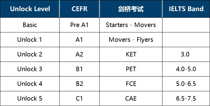 Unlock系列教材参考欧洲共同语言参考标准CEFR的难度划分,对应不同级别的学生需求。此外,该教材还与剑桥英语等级考试、托福、雅思的不同级别相匹配。