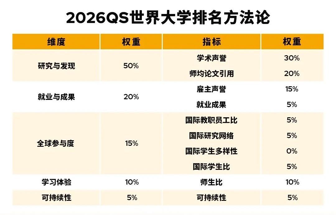 今年的排名基于研究与发现(50%)、就业与成果(20%)、全球参与度(15%)、学习体验(10%)、可持续性(5%)五项指标的加权指数得出。