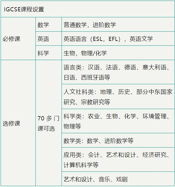 IGCSE标准学制为两年,IGCSE提供70多个科目,一般要求学生至少选择5门课程(含必修)多数学生一般选择5-8门课,也有一些学生会选择10门甚至更多的科目去筛选自己适合的课程。