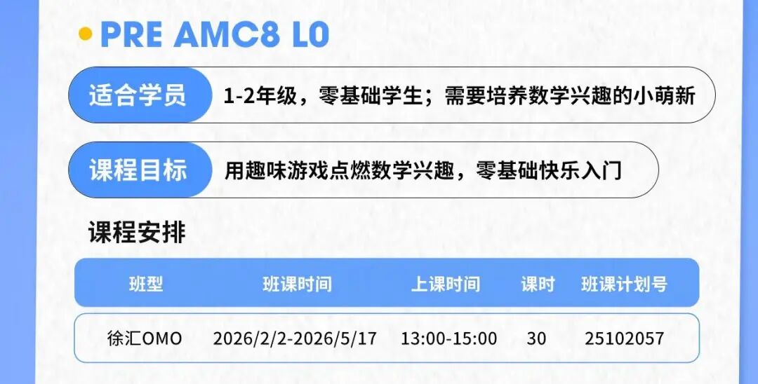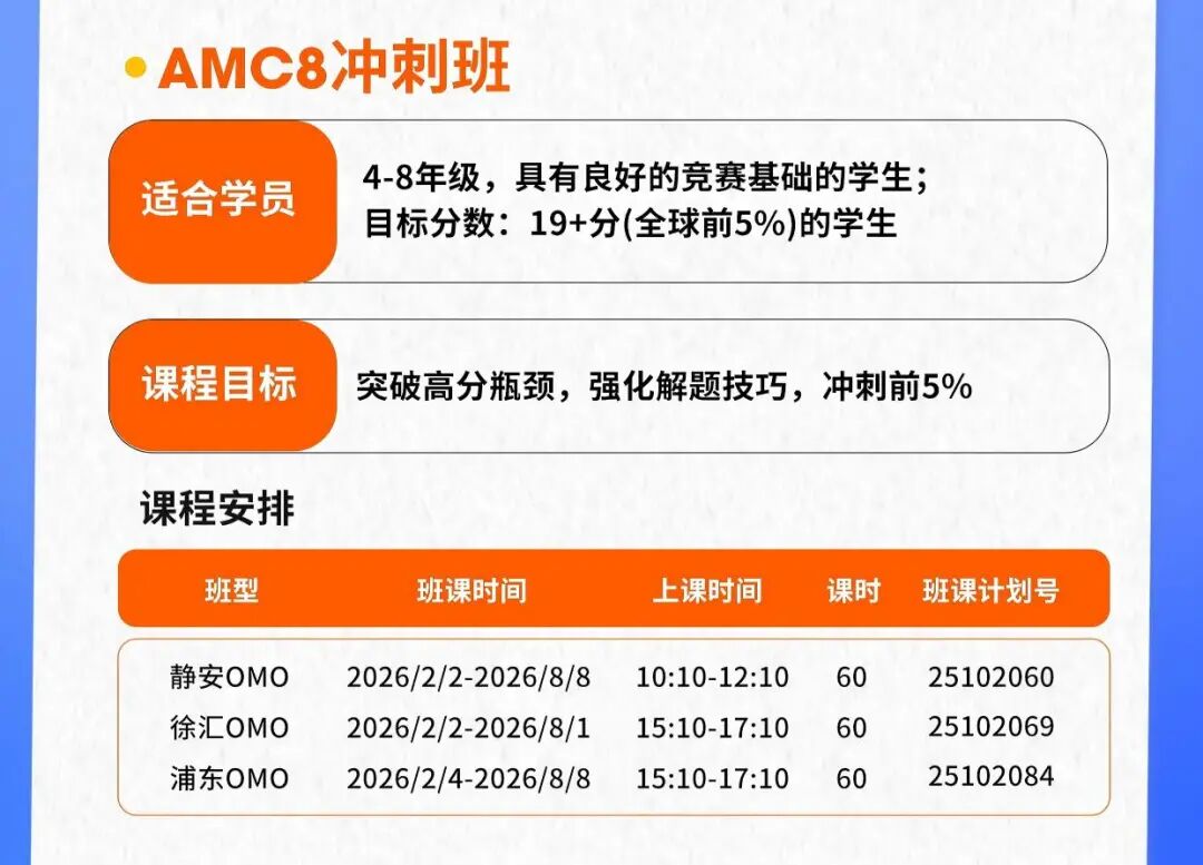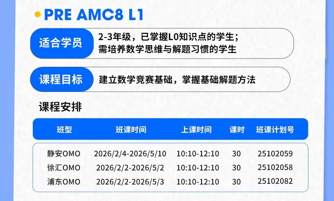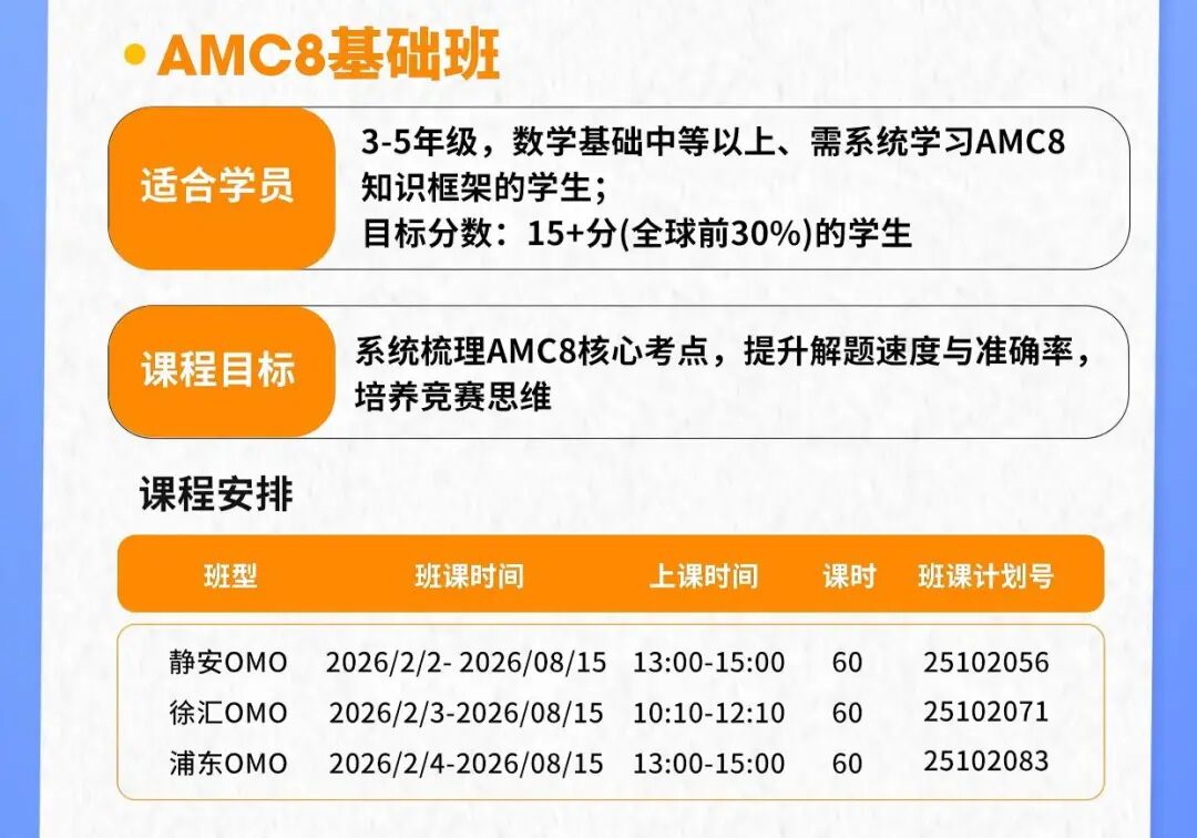 这个寒假我们开设Pre AMC8 L0、Pre AMC8 L1、AMC8基础班、AMC8冲刺班,1-8年级不同阶段均有适合课程,海内外名校师资教学,线上/线下同步开课、静安+浦东+徐汇均有校区,带你直通AMC8全球奖项!
