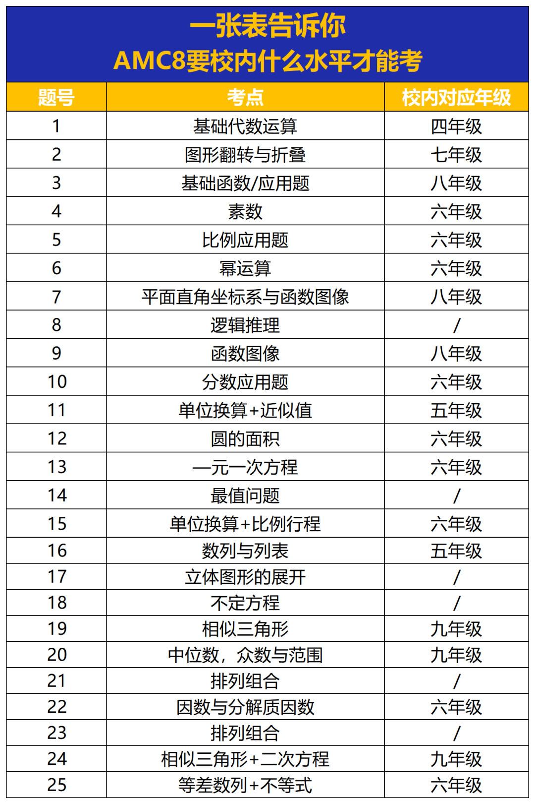AMC8数学竞赛的考点主要分为基础代数、基础组合、基础数论和基础几何四个部分,AMC8的试卷难度是从易到难逐题增加,具体AMC8知识点考察与校内所学知识对应的年级如下表: