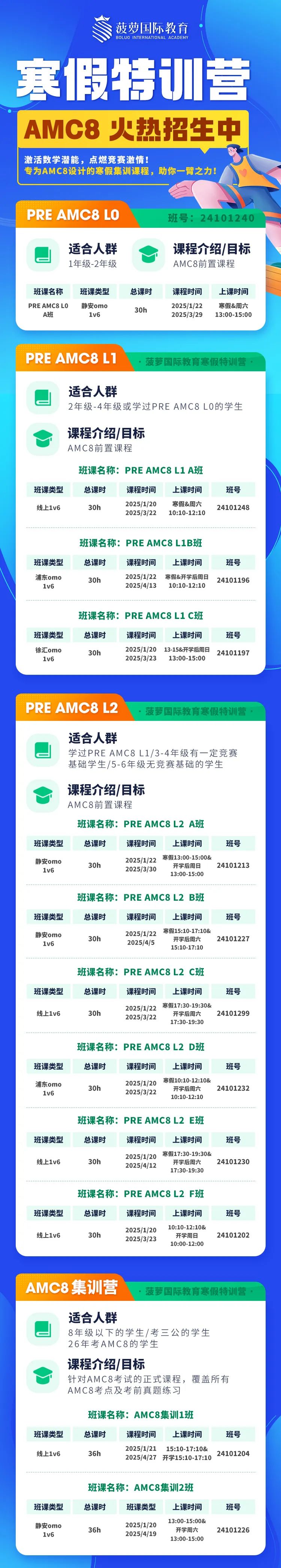 根据孩子不同基础开设了PRE AMC8 L1/L2、AMC8集训班、AMC8冲刺班,以满足不同年级和基础学生的需求。