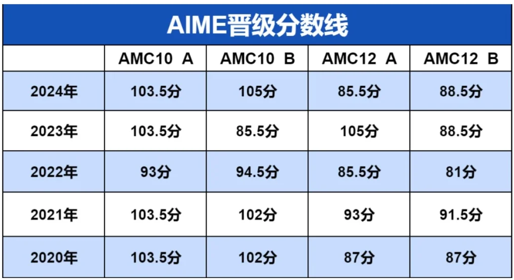 从AMC10/12的历年分数线预判,2023年开始总体呈现稳中上升的趋势。预计2024-2025年的AIME晋级分数线可能会维持当前水平或者有所上升,所以学生需要争取拿到至少105+的成绩,晋级AIME的可能性比较大: