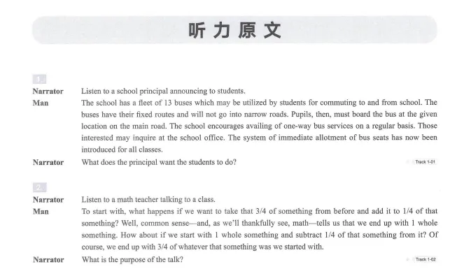 第一段通知说明类(Talk and Announcement):一般由教师、图书管理员、校长说明或发布一些课堂注意事项或校园规章制度,单段语料1分钟左右,每段语料后一个问题,共10题;