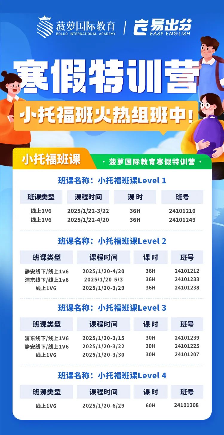 建议学生进行系统性的语法知识点学习。从最重要的句子成分谓语入手,掌握宏观语法结构,如基本句型、从句等,再去理解每一个细的知识点的用法。之后通过练习和模考,总结错题,筛选出薄弱的知识点,进行有针对性地再复习和专项训练。语法知识体系形成之后,会对英文的阅读、听力等输入能力有促进作用,也能大大提高口语和写作的输出能力。 同学们请注意 菠萝小托福班来啦 寒假正是密集训练快速提升的关键时期,对于想要在假期期间提高英语水平,为小托福考试做准备的学生,参加寒假班是一个很好的选择。 菠萝小托福班提供针对小托福考试的强化训练课程,包括模拟试题训练、解题技巧讲解、口语和写作练习等。如果你想要在假期弯道超车,千万不要错过这样的课程机会。