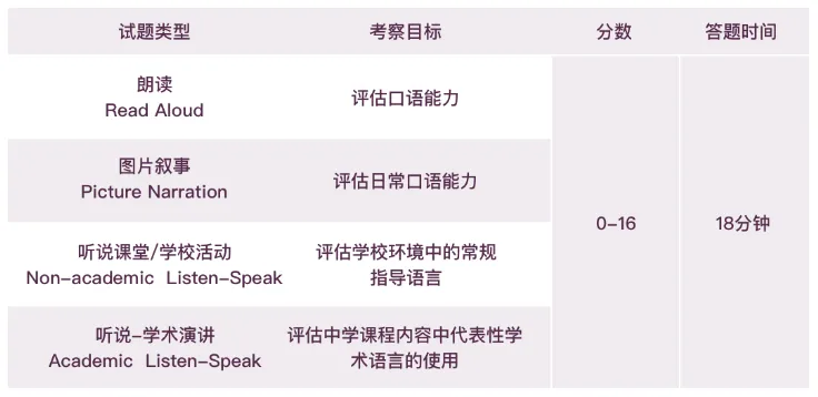 口语考试包含4道题目,旨在测试学生在社交、校园场景及学术背景下的口语表达能力。