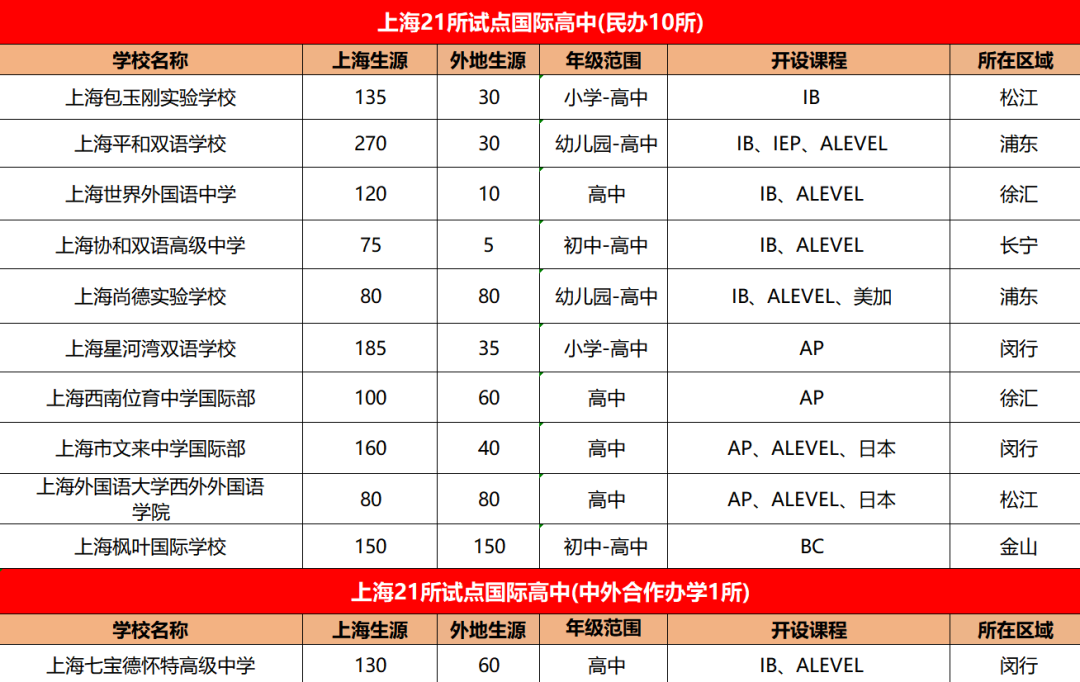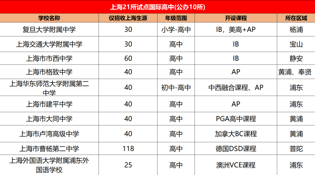 包括10所公办高中国际班、10所民办高中及1所中外合作办学高中。
