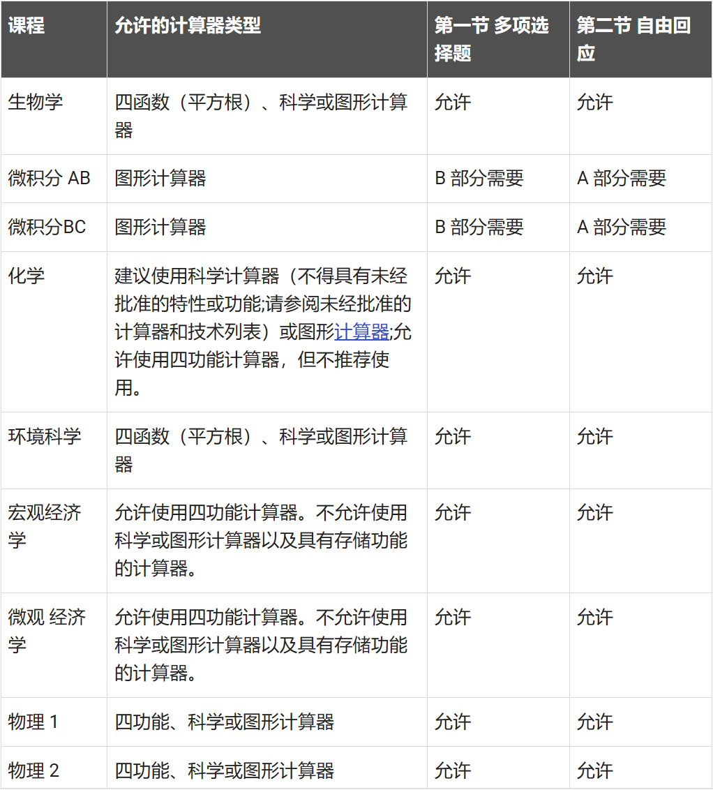 • 参加AP生物、微积分、化学、环境科学、物理、宏观经济学、微观经济学和统计学考试,可使用获批准型号及规定相关功能的计算器。