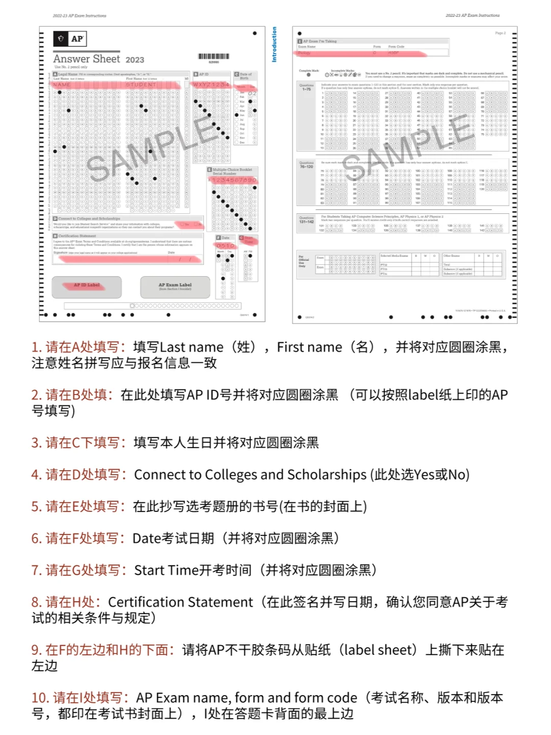 每个考生在参加所报第一门考试当日,监考人员将发放一张学生专属的AP ID的条码贴纸(label sheet),考试时需要撕下条码贴到答题卡和答题册的指定位置。请妥善保存,每门考试都需要带到考场: