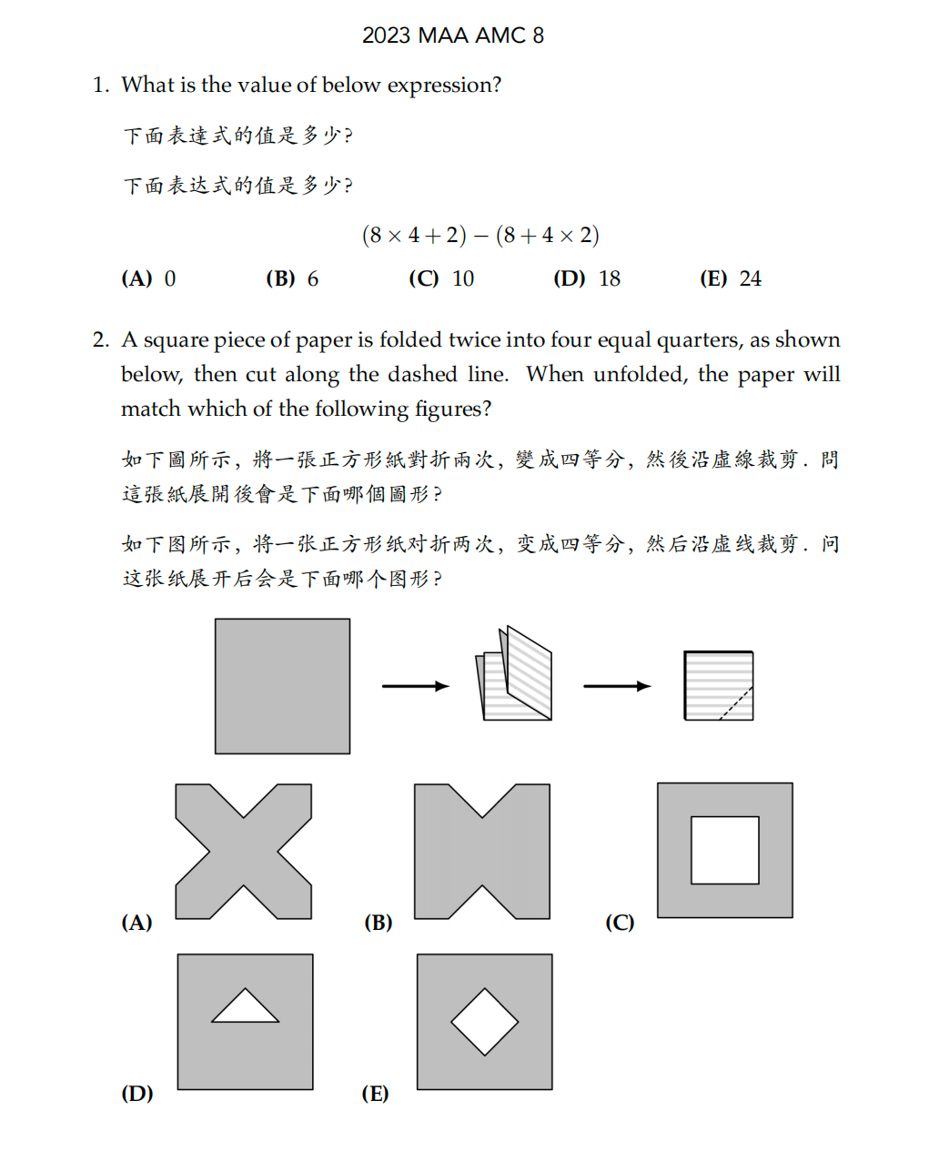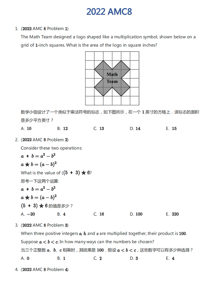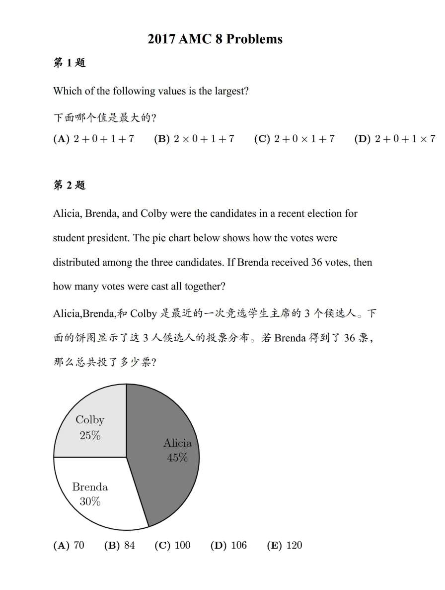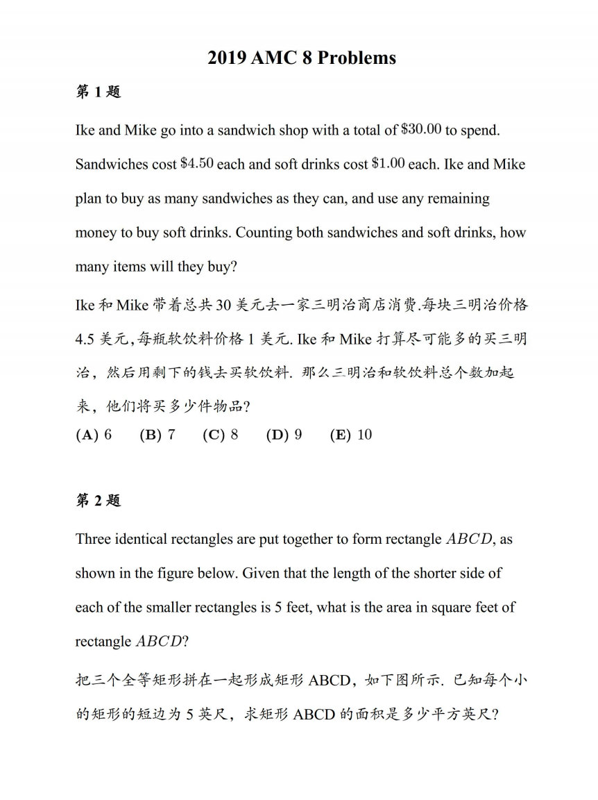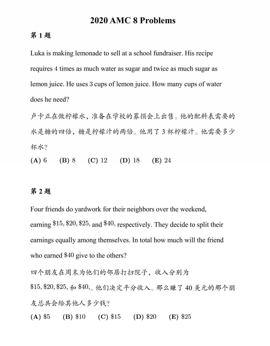 AMC8共25道选择题,限时40分钟,满分25分。